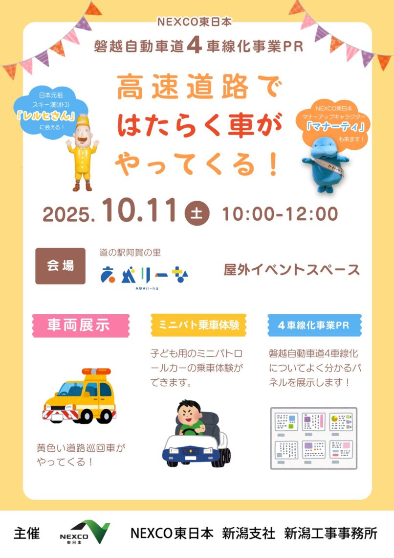NEXCO東日本による磐越自動車道4車線化事業PRとして、高速道路ではたらくパトロールカーの展示と、子ども用ミニパトロールカーの乗車体験が行われます。