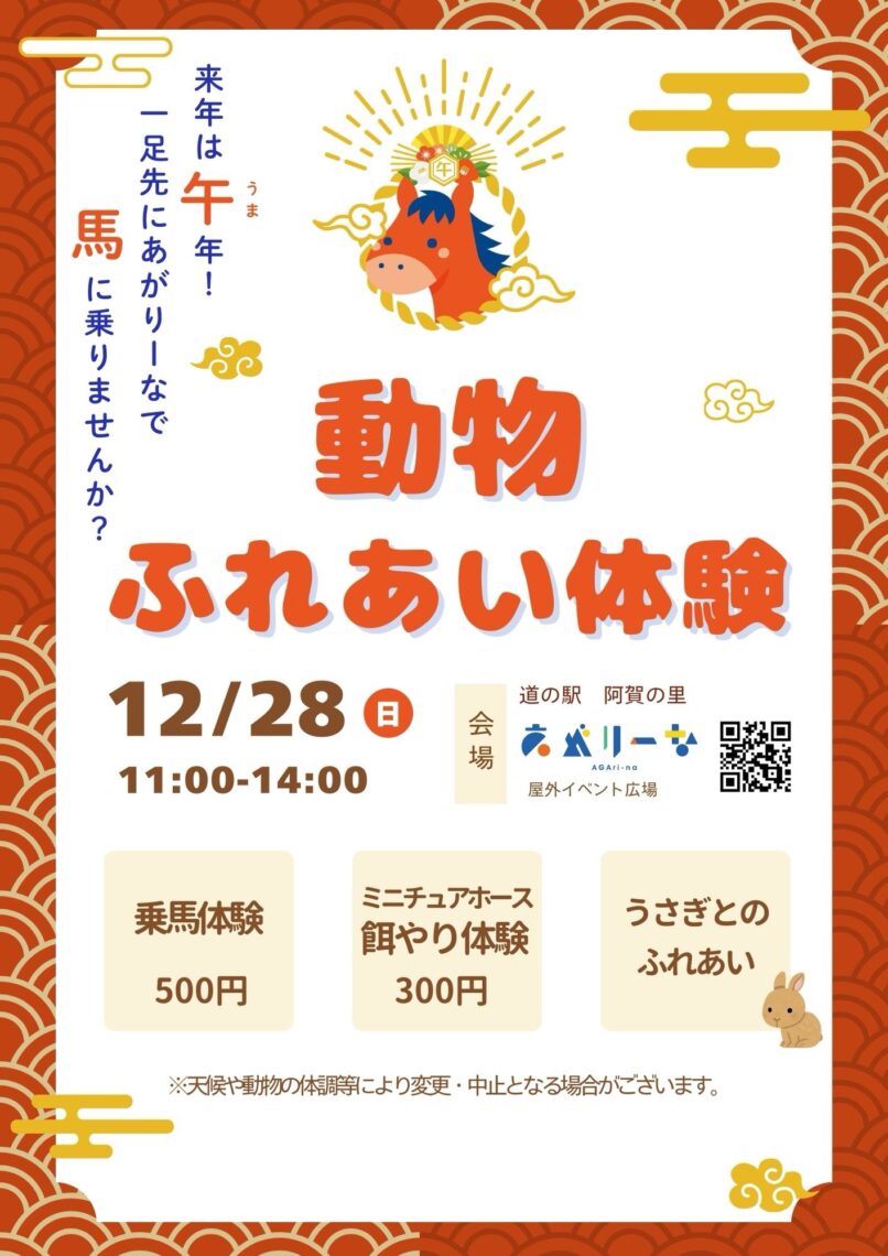 12月20日(土)と12月28日(日)「あがりーな」にお馬さんとウサギさんがやってきます。乗馬や餌やりなど、動物たちとのふれあいを体験いただけます。ぜひ、おいでください。