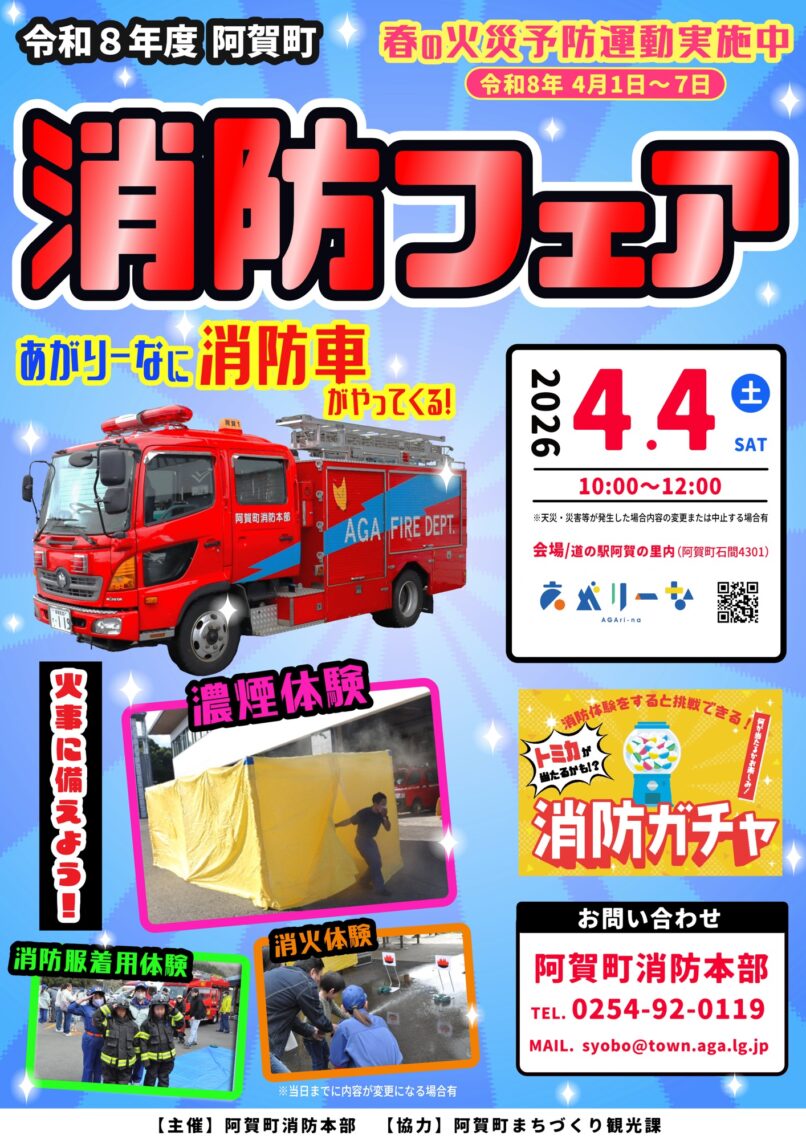 火災予防意識の普及を図ることを目的とした「春の全国火災予防運動」に合わせ、阿賀町消防本部では、4月4日(土)に「あがりーな」において「消防フェア」を開催します。消防車の乗車体験や子ども用消防服の着衣体験、煙霧体験や水消化器による消火体験など、盛り沢山の体験アトラクションを用意して、皆さまのお越しをお待ちしています。トミカなどが当たる「消防ガチャ」も予定されています。ぜひ、おいでください。