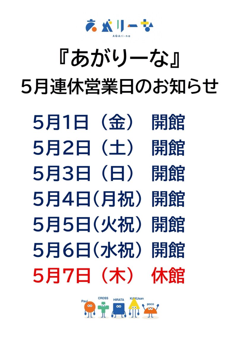 『あがりーな』は、5月の連休中は休まず開館いたします。