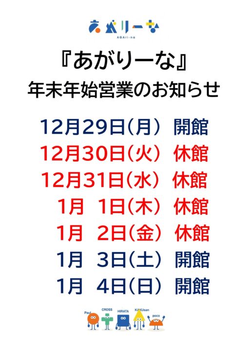 あがりーなは、12/30(火)・12/31(水)・1/1(木祝)・1/2(金)の4日間を休館といたします。 新年は、1/3(土)より皆さまのご来場をお待ちしております。 なお、お隣りの阿賀の里物産館は、年末年始も無休で営 […]